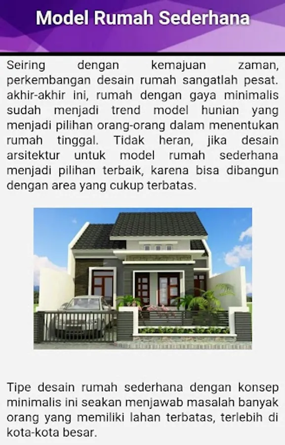 For those of you who are confused looking for a simple home model design to plan a simple dream house, in this app we have some pictures of the latest Simple House model that can be used as a reference for finding ideas so you can decide what kind of home design is suitable for a comfortable home .