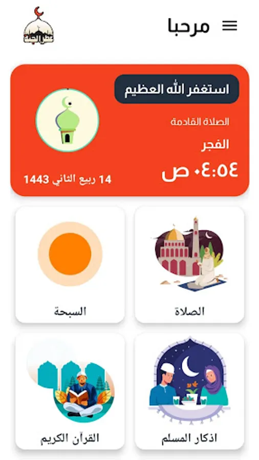 The first section: Prayer 🕌: The Perfume of Paradise application contains prayer times. The prayer is Imad Al-Din. Through this application, follow the prayer times according to your location without the need to connect to the Internet 😍