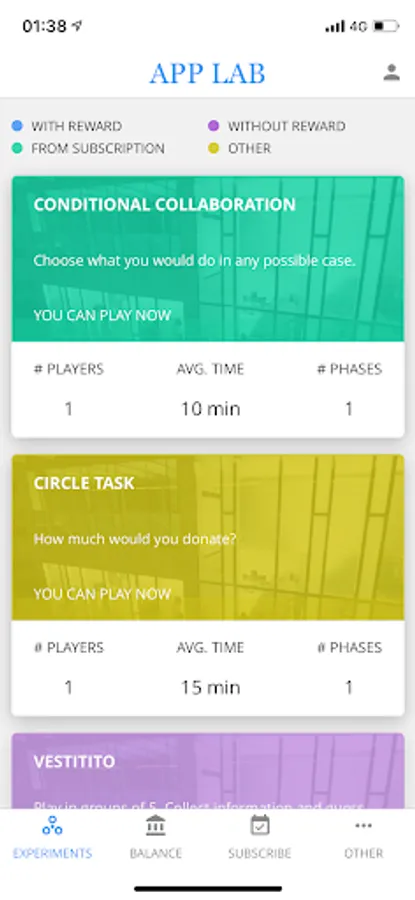 App Lab gives you access to experiments and surveys written for you by researchers in social sciences. Choose the experiment or survey you want to participate to, subscribe to new ones, and get your reward.