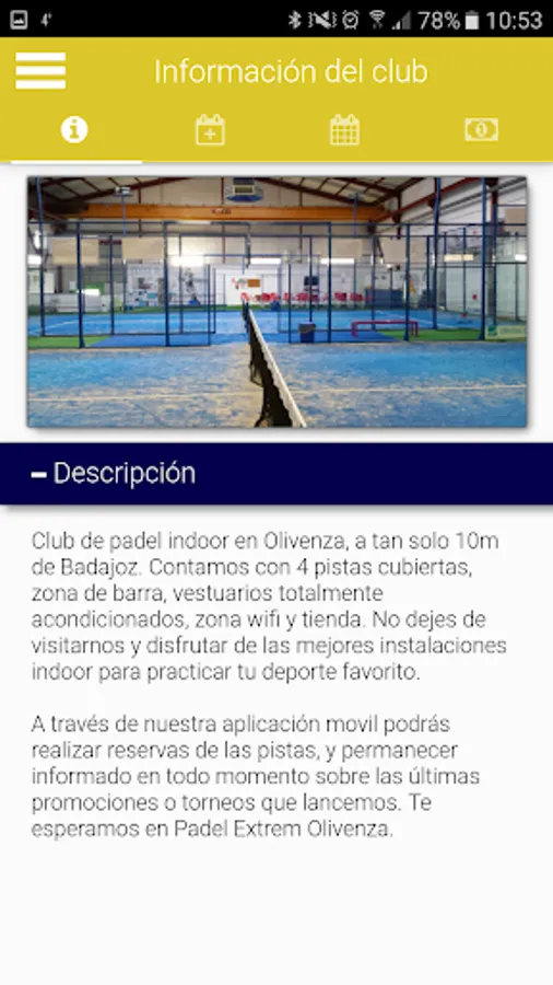 Indoor paddle tennis club in Olivenza, just 10min. Badajoz. We have 4 indoor courts, bar area, fully conditioned changing rooms, wifi and shop. Do not forget to visit us and enjoy the best indoor facilities to practice your favorite sport.