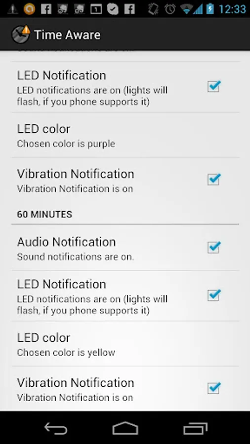 Wish to keep track of certain intervals of the day, i.e., 15mins, 30mins, 45mins, 60min; but don’t want to set an alarm for each one? Then look no further -- this is the app for you! Time Aware is a fully customizable time keeping application (nearly – more developments soon). When active, and according to your preferences, Time Aware will notify you of 15, 30, 45, and 60 minutes (1 hour) passing, by audio, LED (if your device supports it), toast, and vibrate notifications. Of course, either by interval or globally, if the user desires, the notifications can be customized.