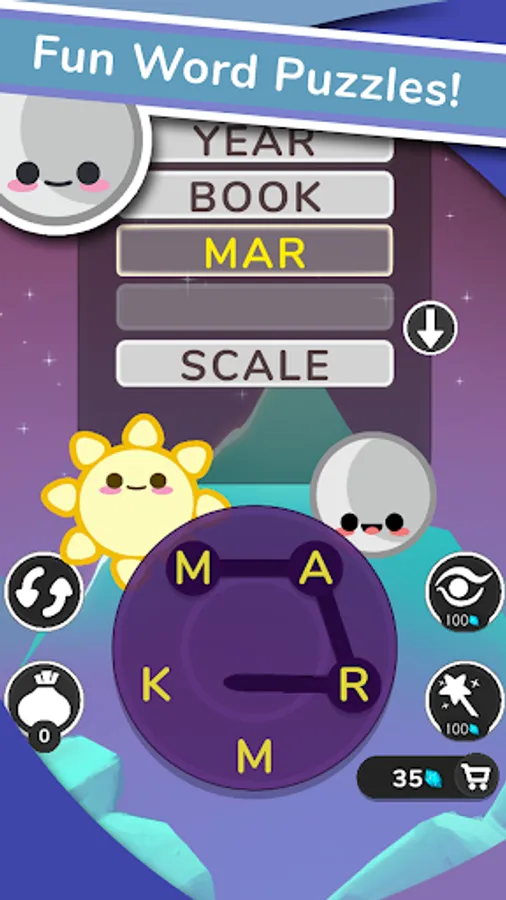 Wordmates challenges you to create chains between a top and bottom word by stringing together two-word phrases. Search the dial to find the word that creates the correct chain to reunite the mates!