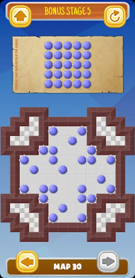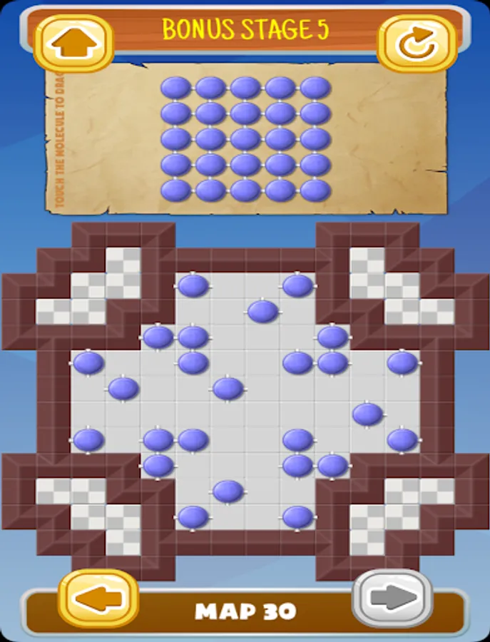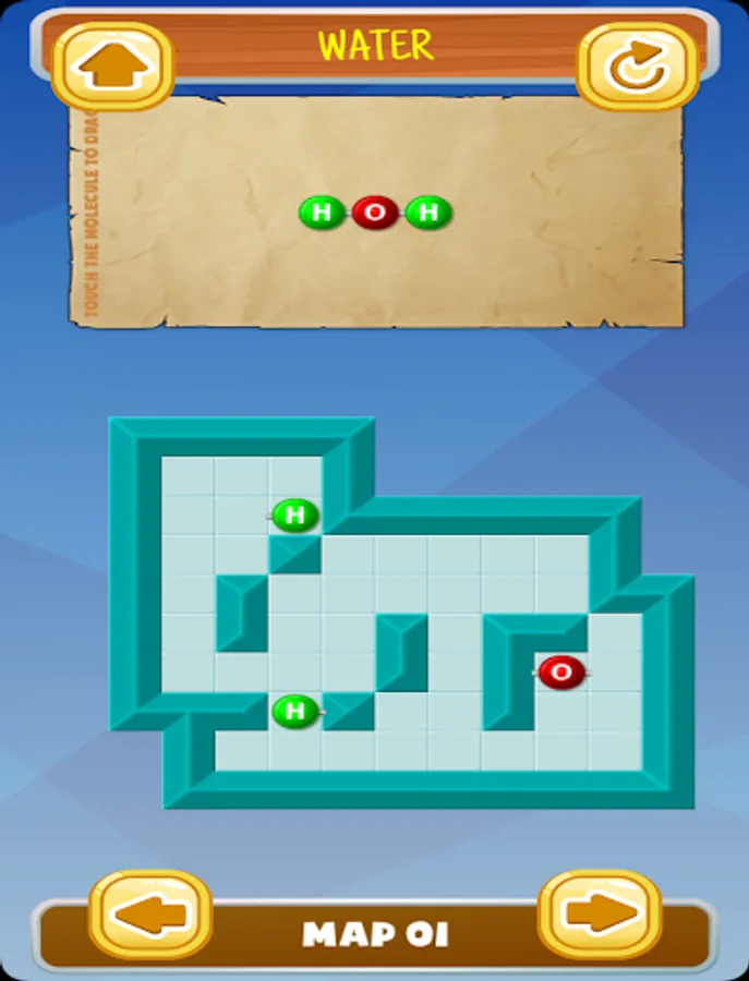 Atoms can move up, down, left and right, and they don't stop moving until they collide with something. You can move on to the next level when the molecule is assembled.