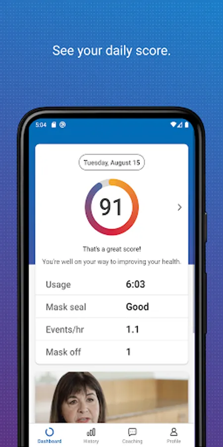 With myAir, you can easily access your daily sleep therapy data to monitor your therapy progress. Simply log in to see your nightly myAir score, which shows how well you slept on therapy at a glance. Detailed metrics help you track your therapy progress over time. You can also download a therapy summary report to keep for your records or share with your healthcare provider.