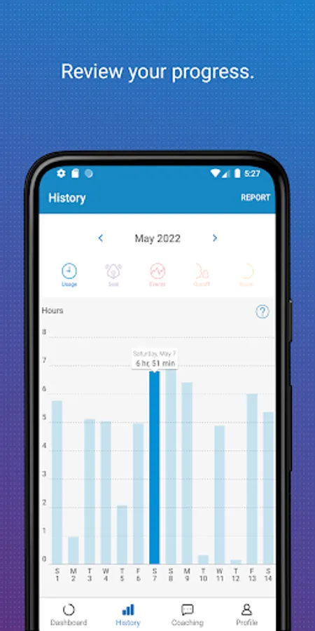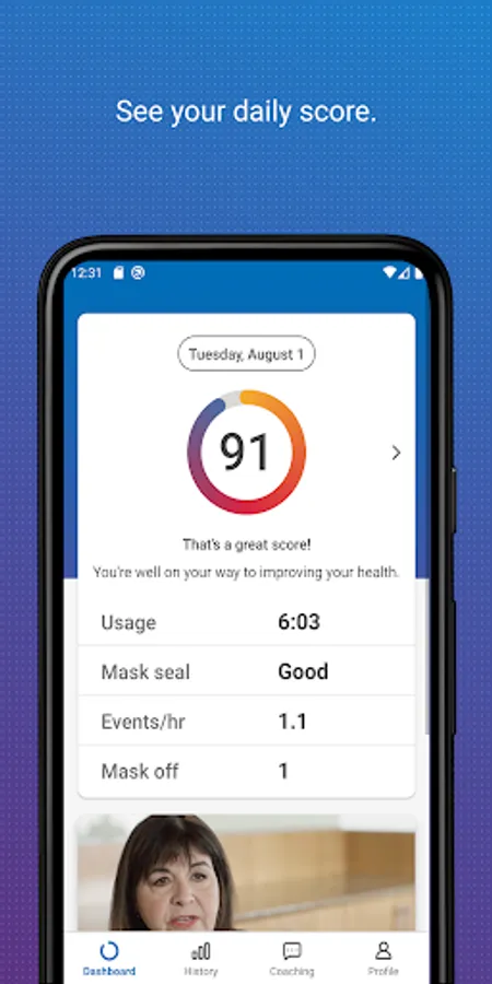 With myAir, you can easily access your daily sleep therapy data to monitor your therapy progress. Simply log in to see your nightly myAir score, which shows how well you slept on therapy at a glance. Detailed metrics help you track your therapy progress over time. You can also download a therapy summary report to keep for your records or share with your healthcare provider.
