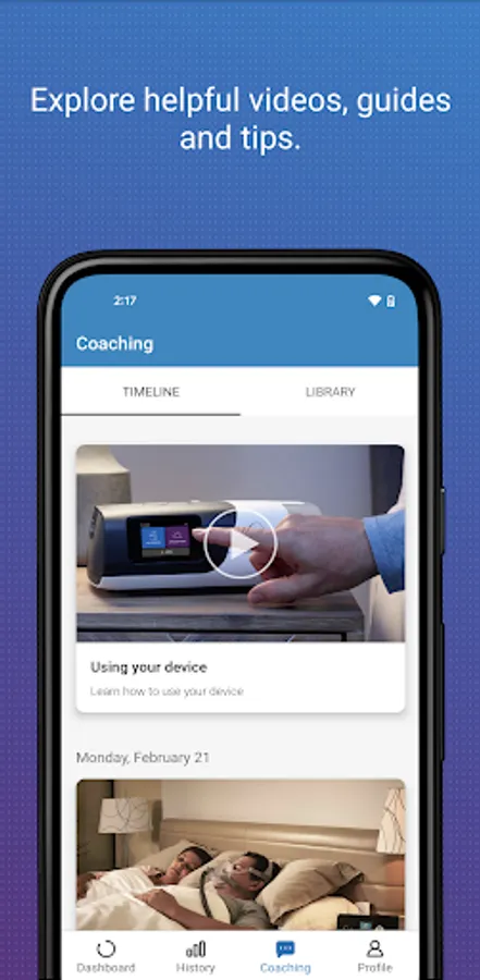 myAir offers tailored coaching, tips and videos to increase your comfort and success. For example, if you have problems with your mask seal, myAir will provide tips about how to fix it. The app also offers a full Library of helpful videos and guides to answer common questions.