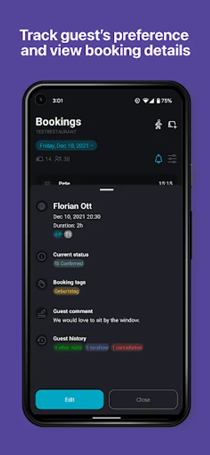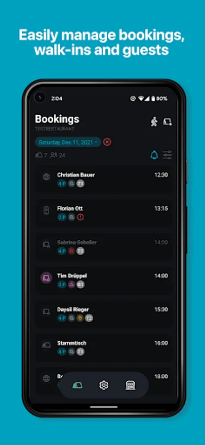 - Create reservations and walk-ins incl. booking tags (e.g. birthday, allergies), notes and tables