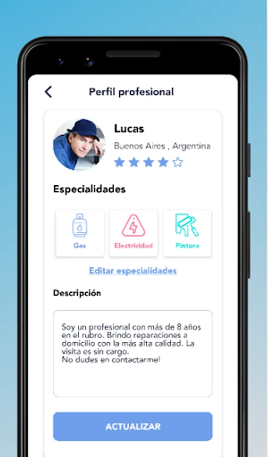 - You just have to register, search for the category in which you want to be known, upload your profile and voila! You will have the possibility of being contacted and hired within the APP.