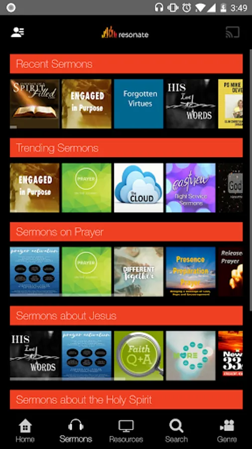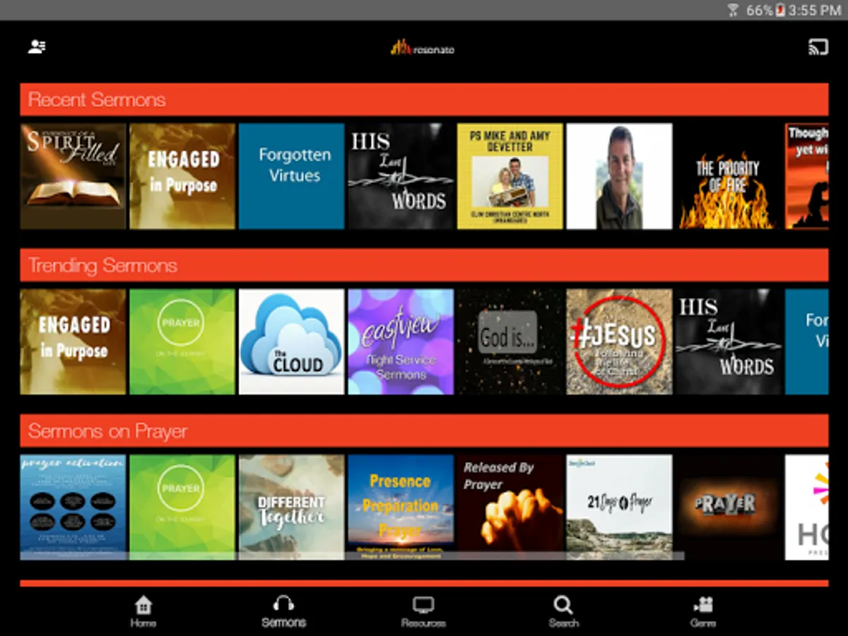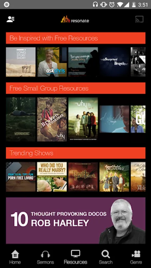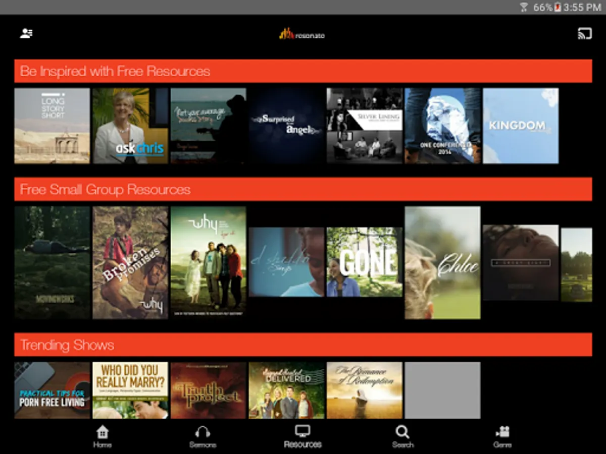 Resonate lets you view our extensive library of sermons, movies and resources on your smart device. Watch/listen to free titles and view past purchases. Your Watchlist is a great place to keep track of the titles you want to watch next. You can also cast everything to your Google ChromeCast.