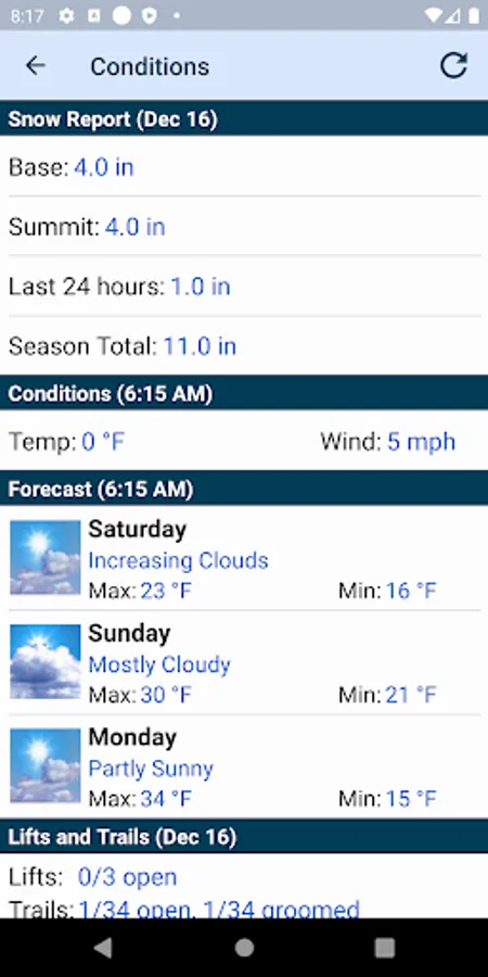 • Find up-to-date information about the mountain, including snow conditions, weather, and webcam images.
