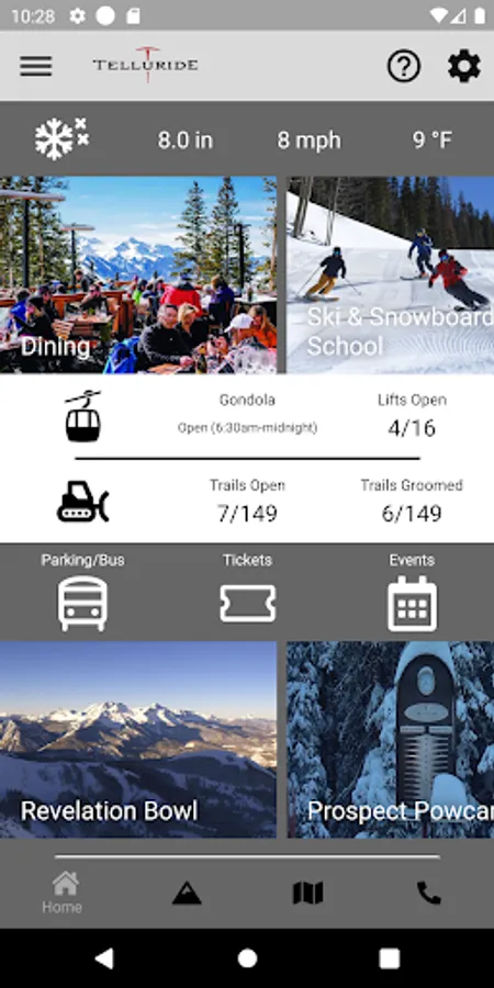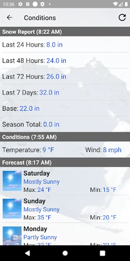 • Find up-to-date information about the mountain, including snow conditions, weather, and webcam images.