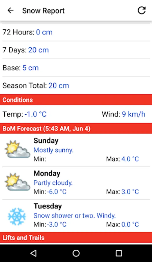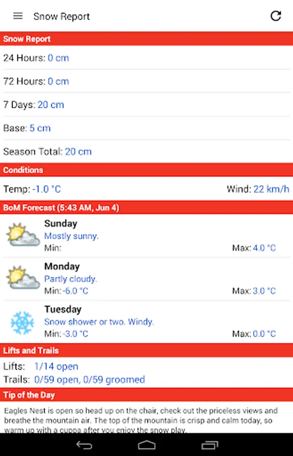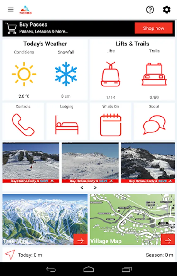 • Find up-to-date information about the mountain, including snow conditions, weather, and webcam images.