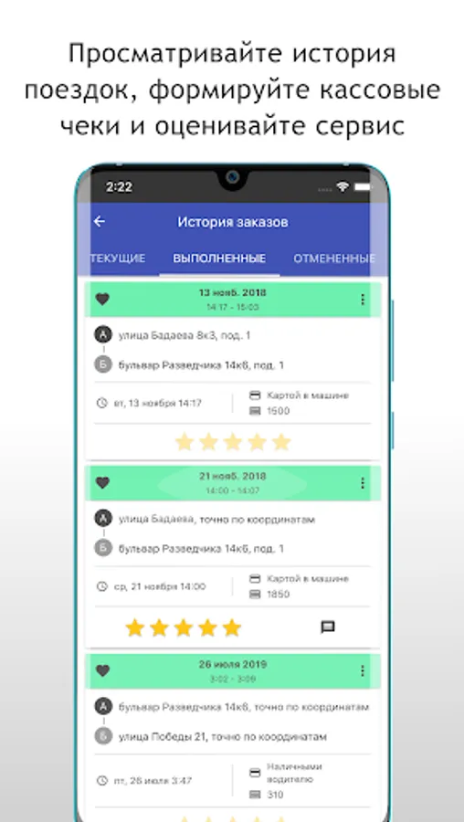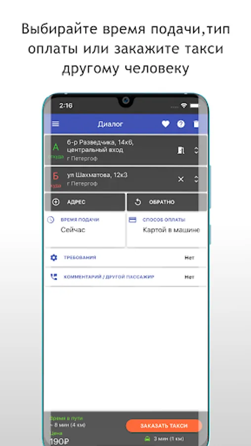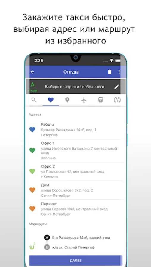 To order a taxi, it is not necessary to spend time dialing and talking with the dispatcher. Book a car to your favorite address with a couple of taps on the screen: each option is at hand!