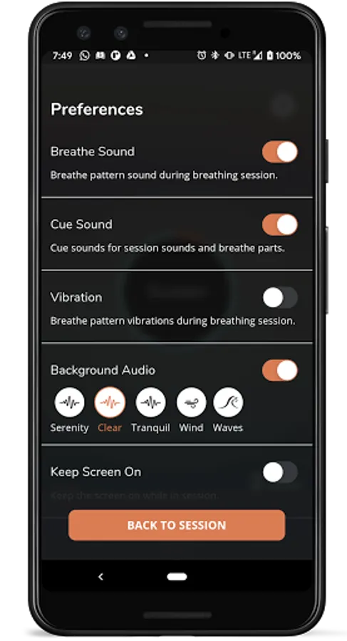 You can set breathe cue sounds, and vibration cues to follow along during the session without looking at the screen.