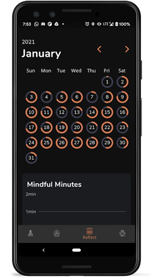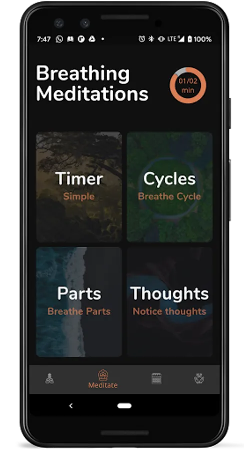 You can start simple meditation or any mode of active meditation to help you focus more on the breath. This may include tapping on-screen on each inhale, each exhales or each time you find your mind wandering.