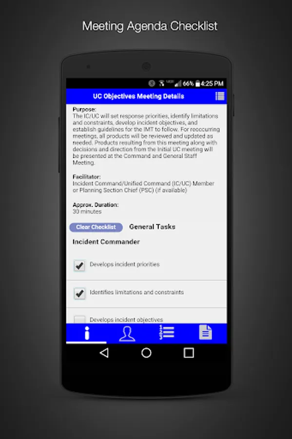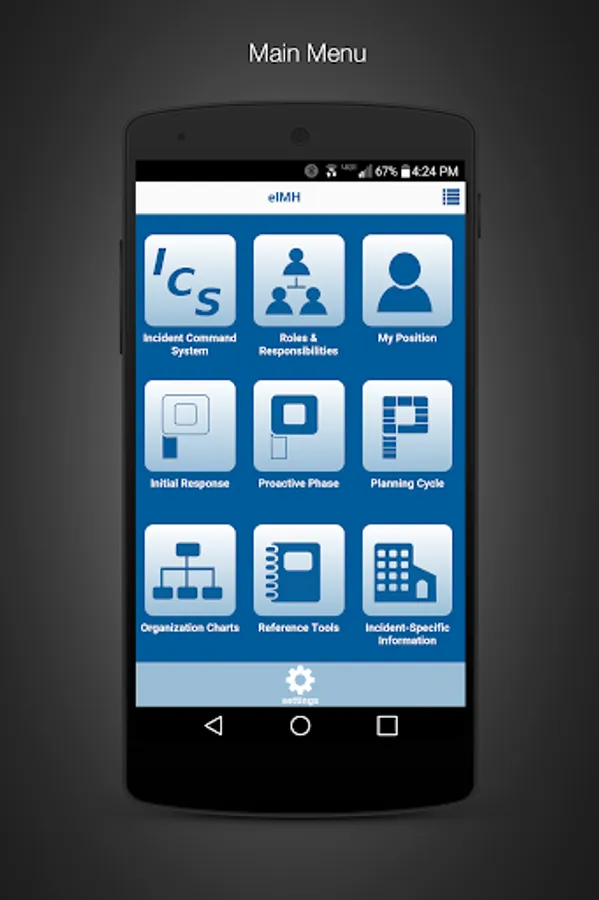 eIMH puts the 380+ page USCG IMH content in a super easy to use format on your phone or tablet. More than just a reference tool, eIMH provides working checklists for things such as meeting attendees and agendas to help you facilitate the meetings and stay organized.