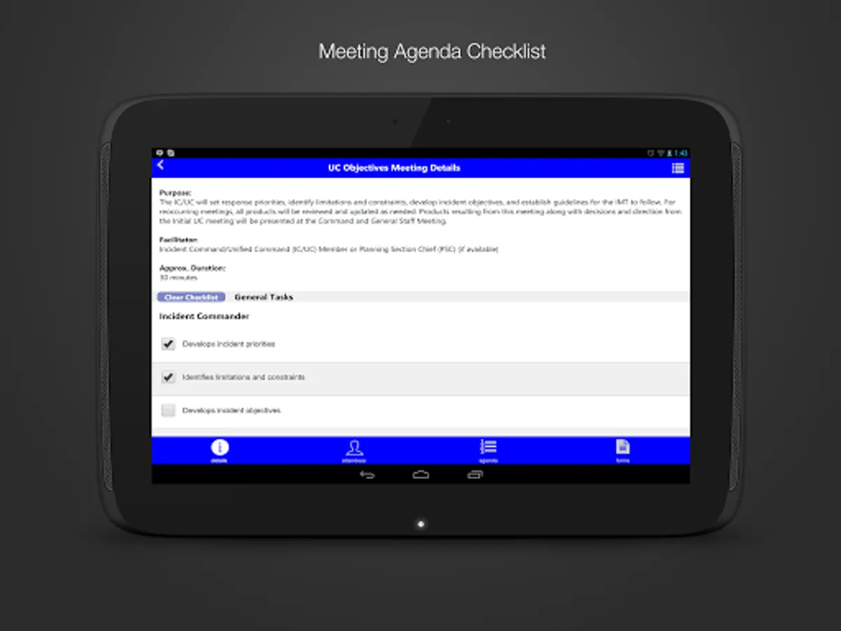 • Meeting details pages with checklists for tasks, attendees, agendas as well as a listing of ICS forms normally used during those meetings.