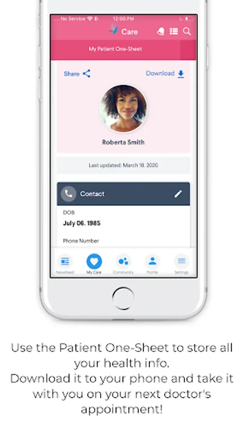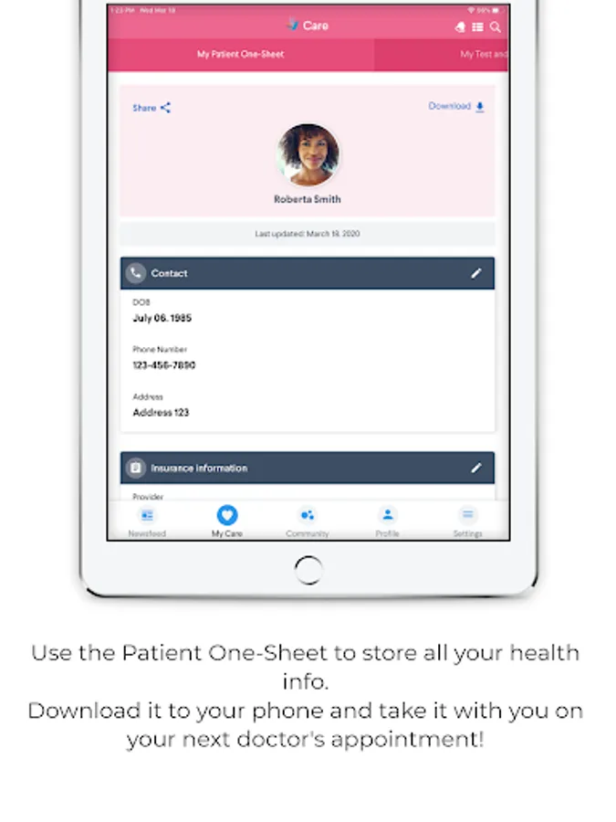 • Keep everything in one place with our Patient One-Sheet, a secure, printable, and shareable form that allows you to easily store and maintain all your basic information – doctors, insurance info, medications, and their dosages, and other key data.