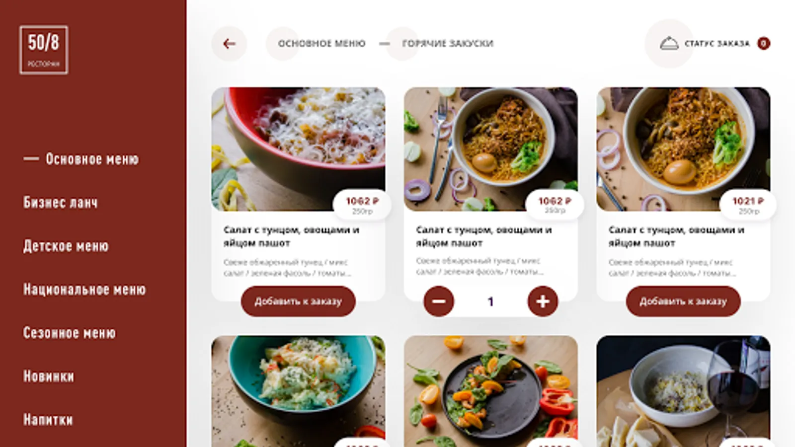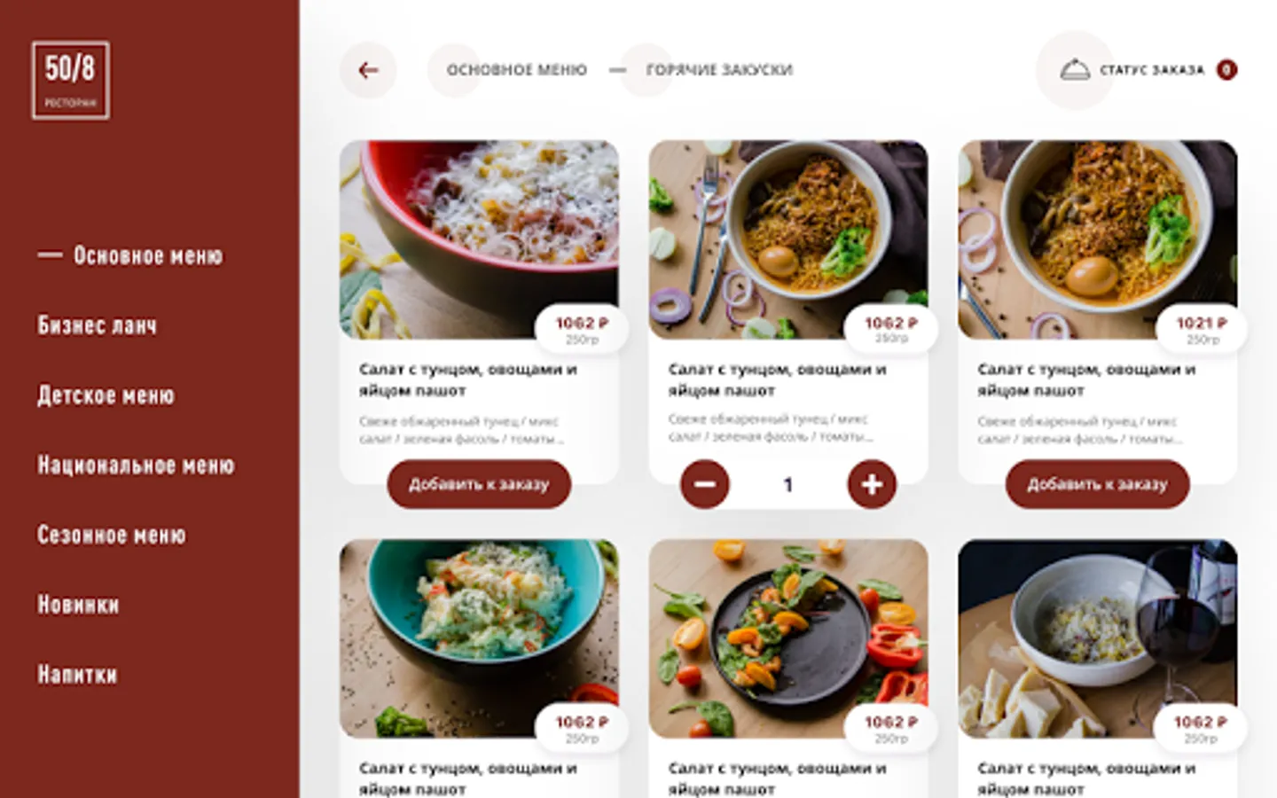Restaurant menu 50/8. Restaurant menu 50/8. The application provides an opportunity to get acquainted with the restaurant menu, see images of dishes and find out the current prices.