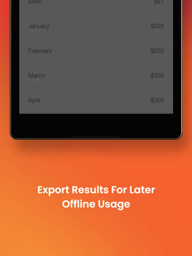 Save favorite locations, look up per diem costs / breakdown, and export any result to either CSV or PDF for offline and later usage.