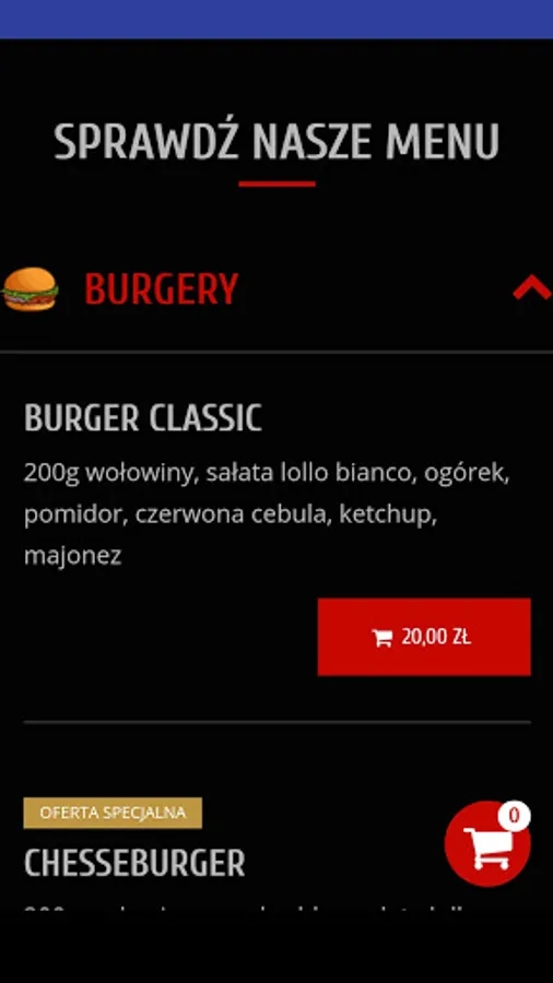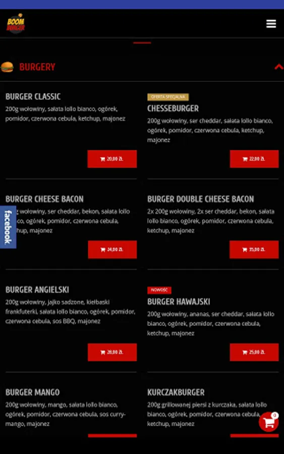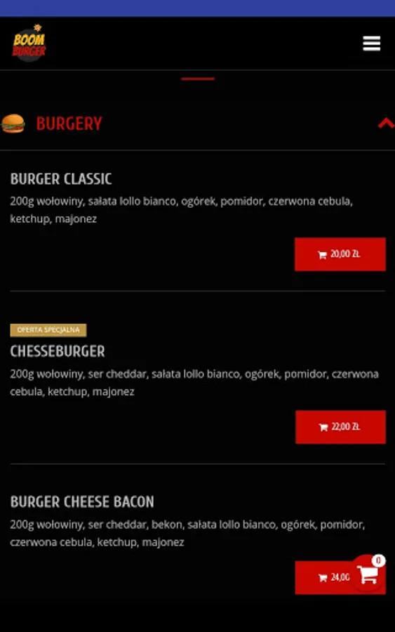 Application for ordering food from the Boom Burger restaurant in Wieliczka.