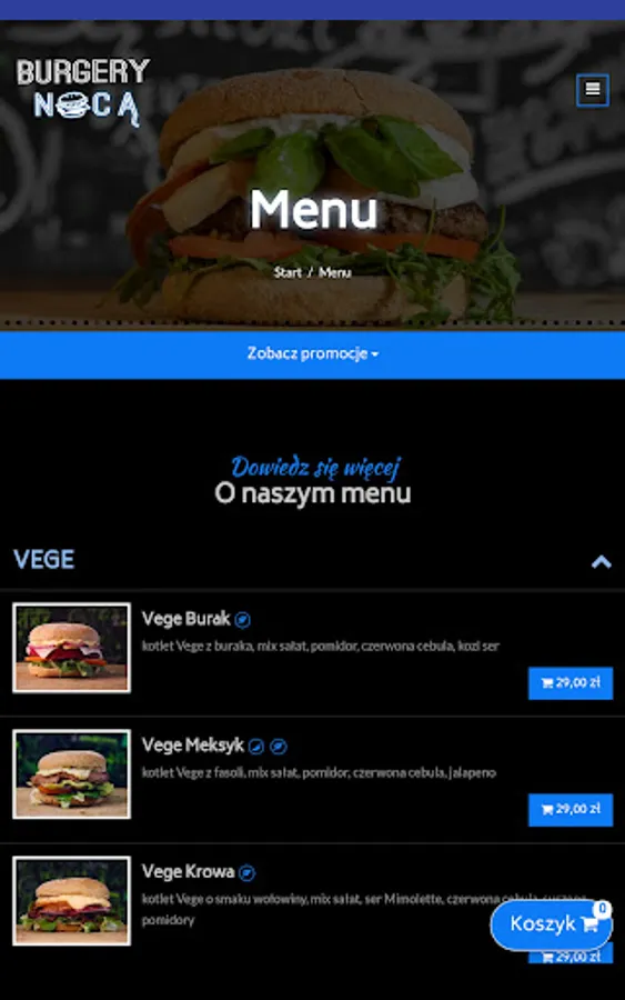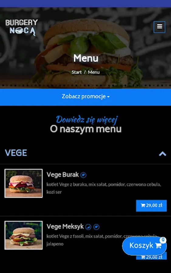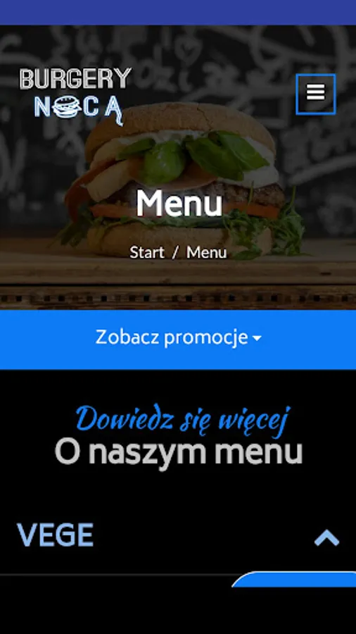 Application for ordering food from Burgery Nocą restaurant in Warsaw.