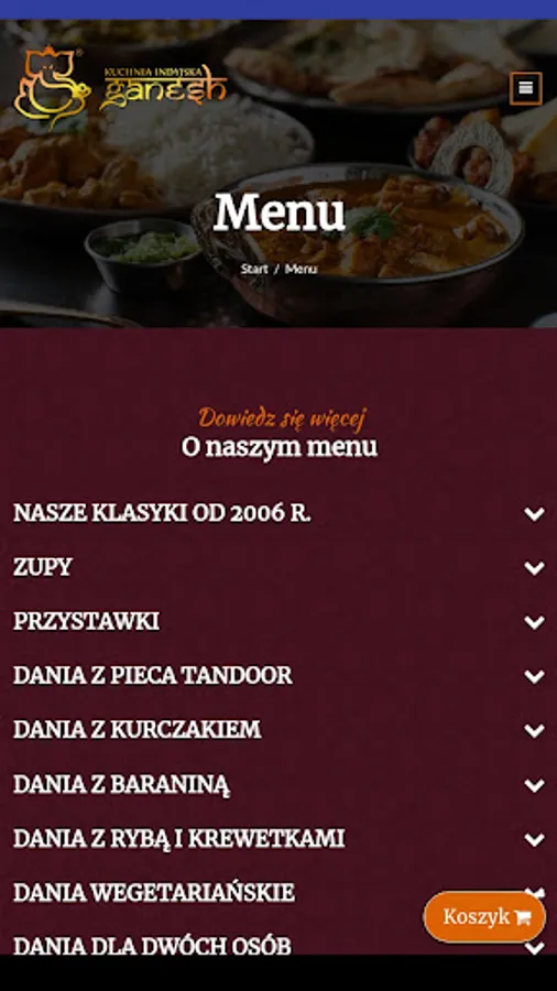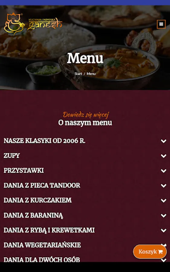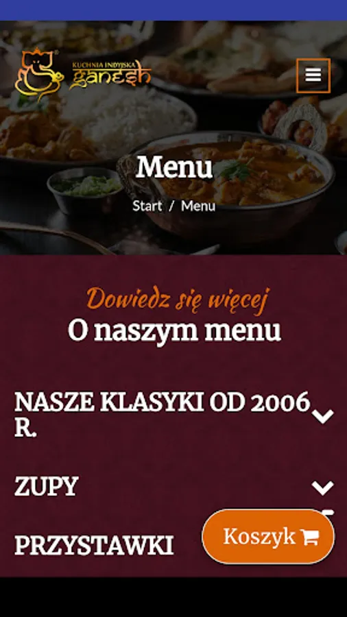 An application for ordering food from the Manufaktura Ganesh restaurant in Łódź.