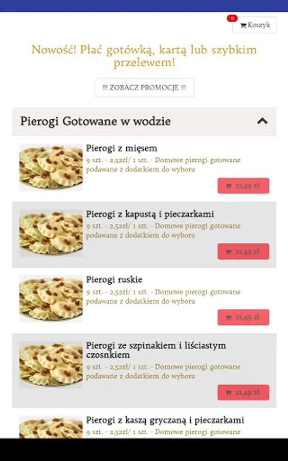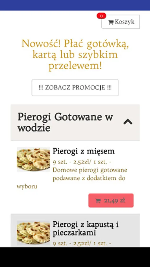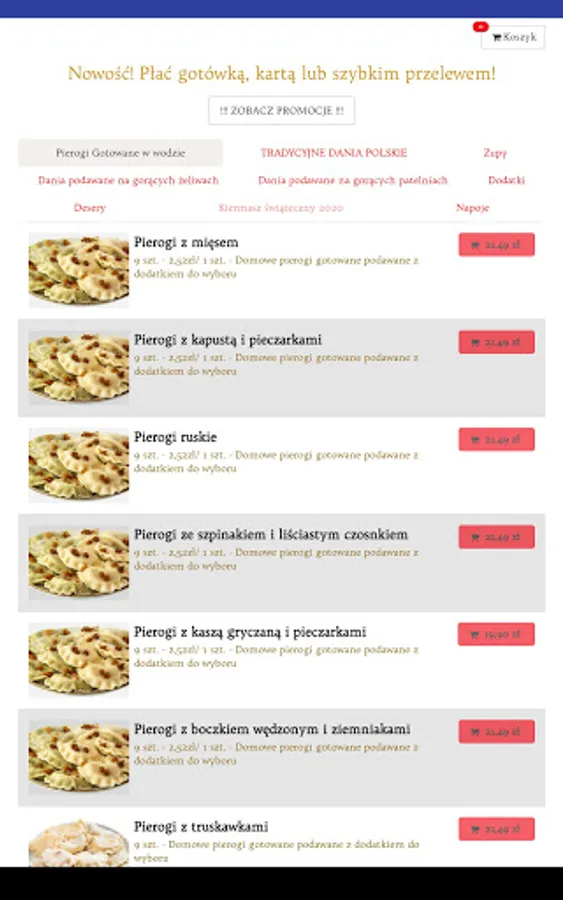 The application for ordering food from the Gościniec - Polskie Pierogi restaurant in Warsaw.