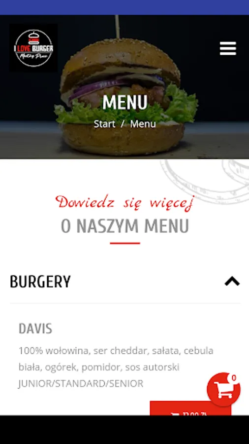 Application for ordering food from the I Love Burger restaurant in Lubin.