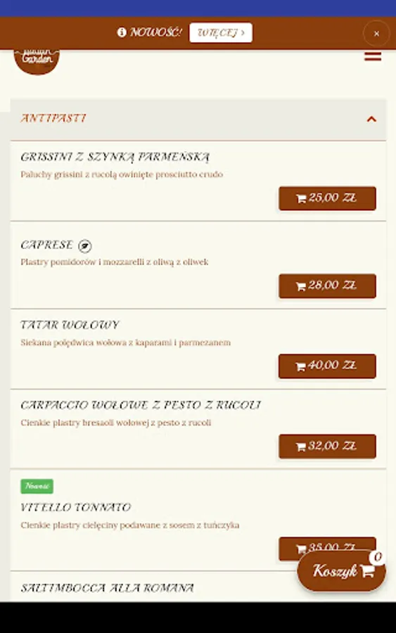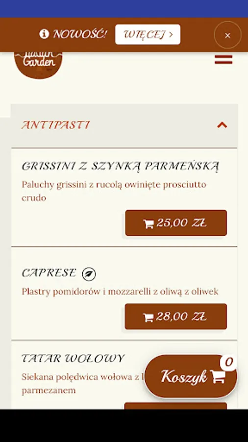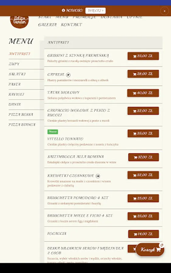Application for ordering food from the Italian Garden restaurant in Puławy.