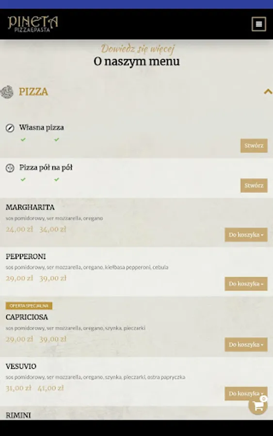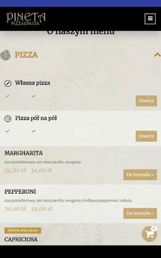 Application for ordering food from the PINETA PIZZA & PASTA restaurant in Warsaw.