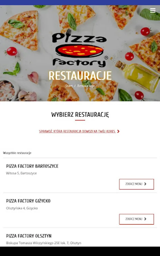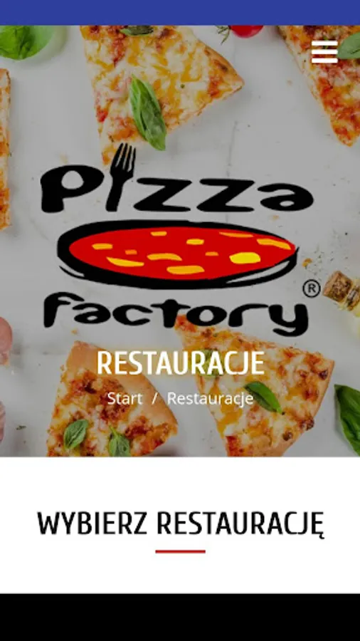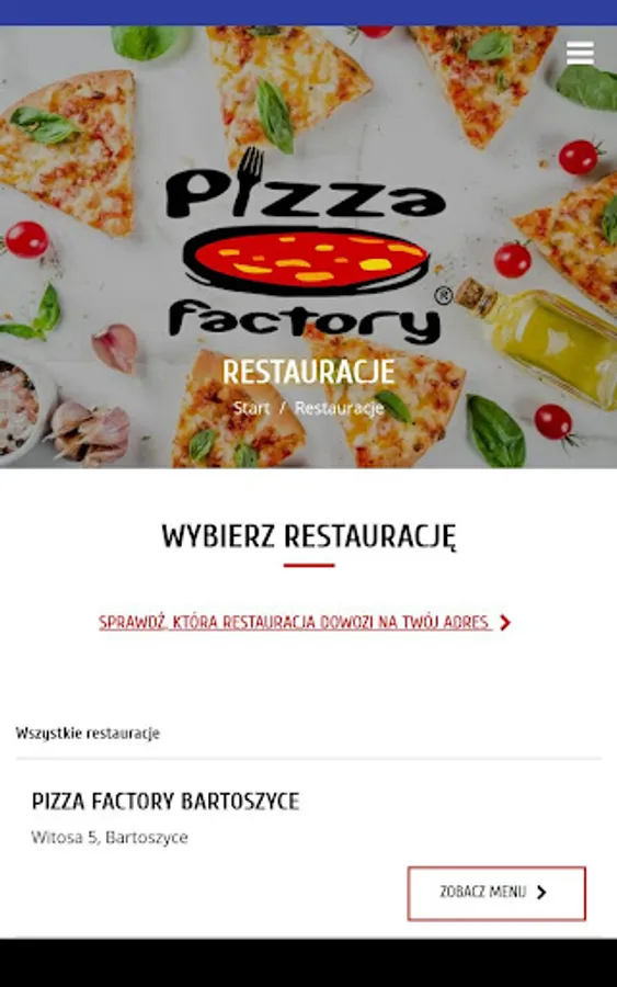 Application for ordering food from the Pizza Factory restaurant in Bartoszyce, Kętrzyn, Giżycko, and Olsztyn.