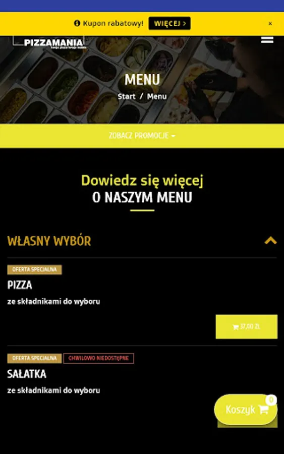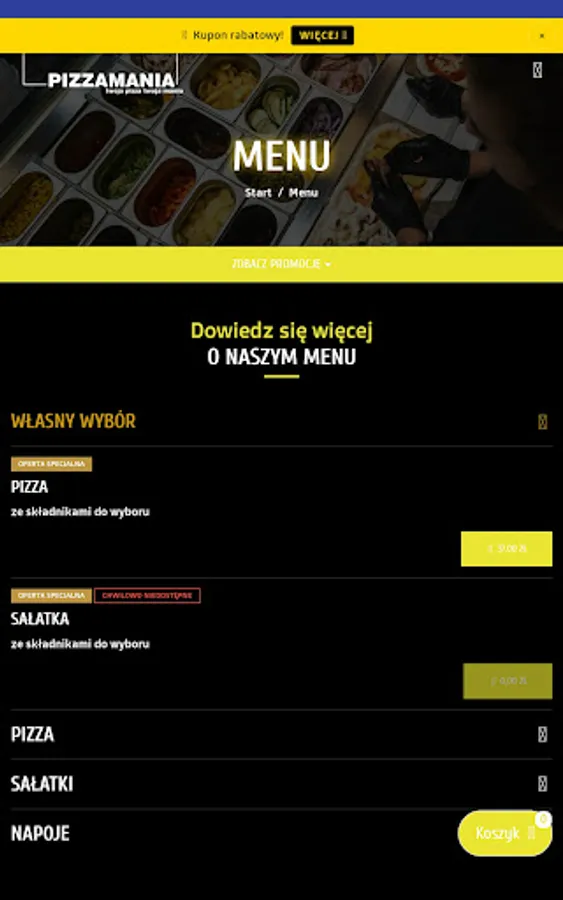 An application for ordering food from the Pizzamania restaurant in Kielce.