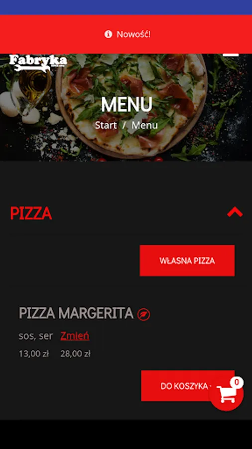 Application for ordering food from the Pizzeria Fabryka restaurant in Chojnice.