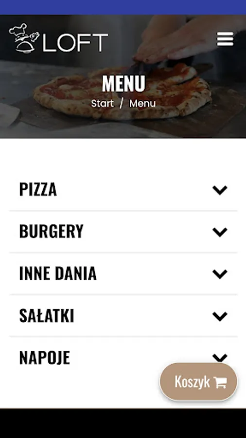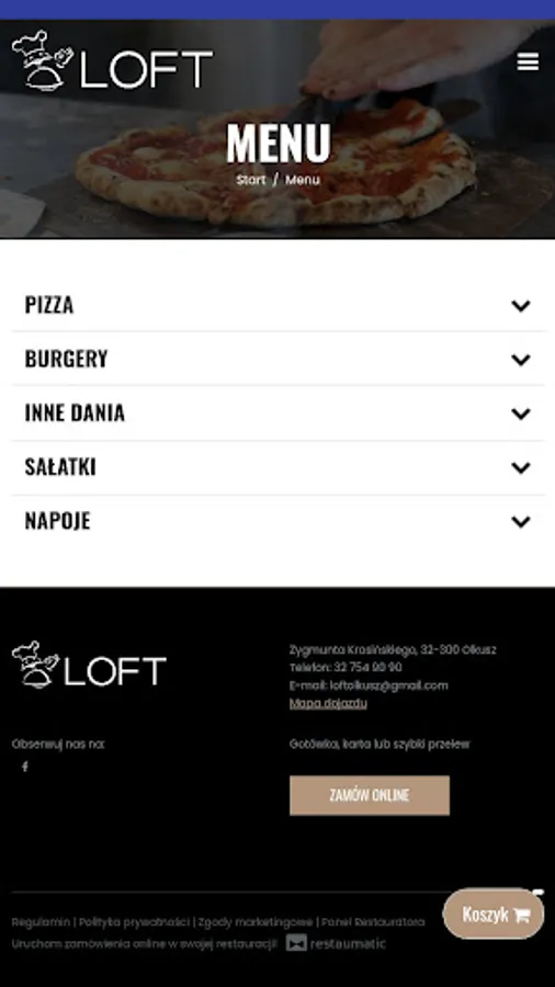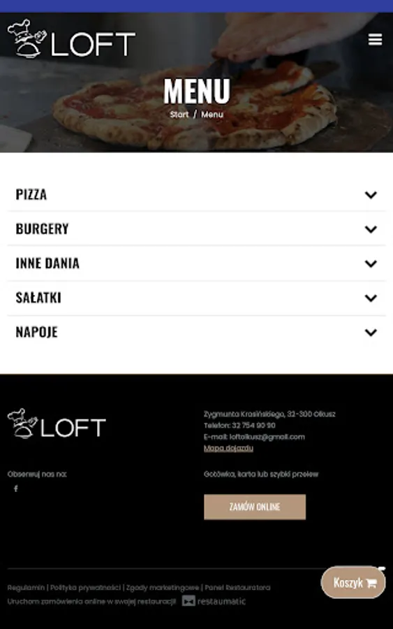 An application for ordering food from the Pizzeria Loft restaurant in Olkusz.