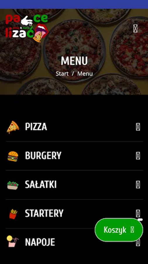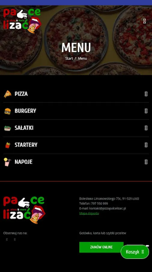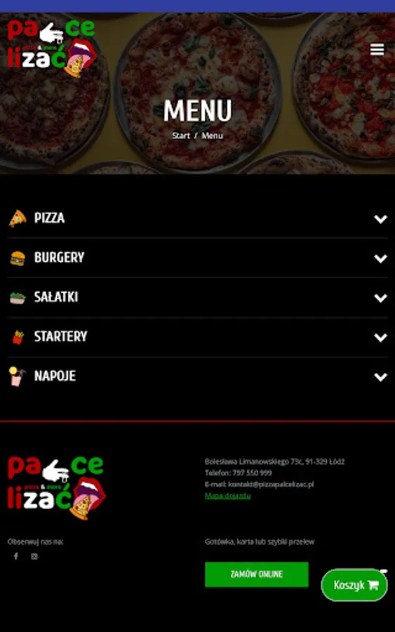 An application for ordering food from the Pizzeria Nocna Palce Lizać restaurant in Łódź.