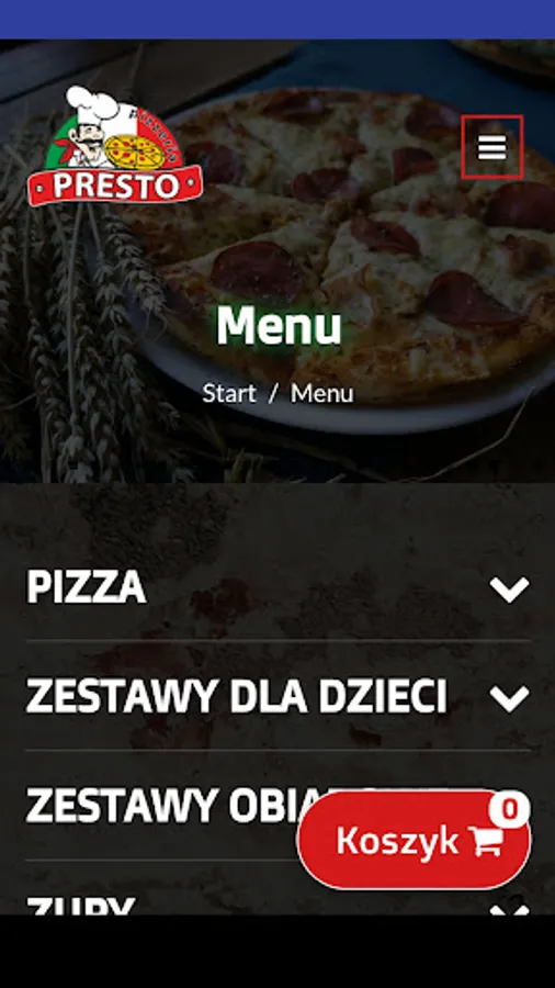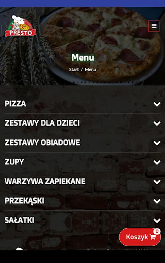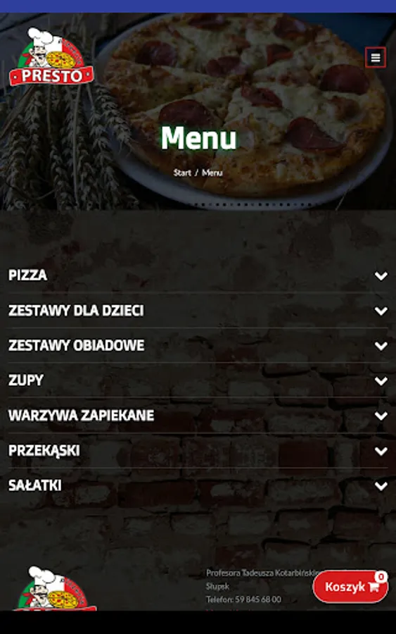 An application for ordering food from the PIZZERIA PRESTO restaurant in Słupsk.
