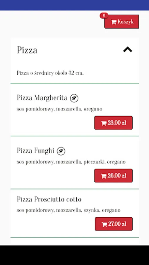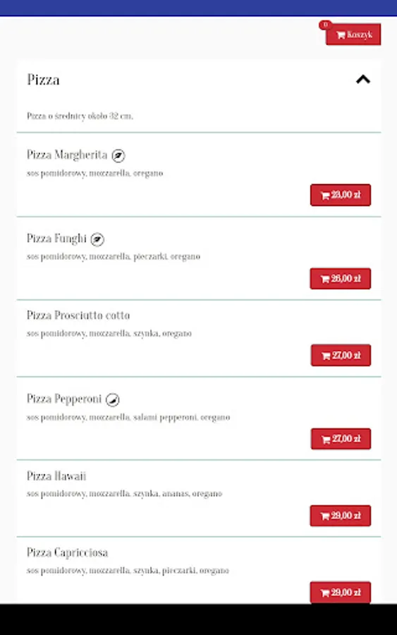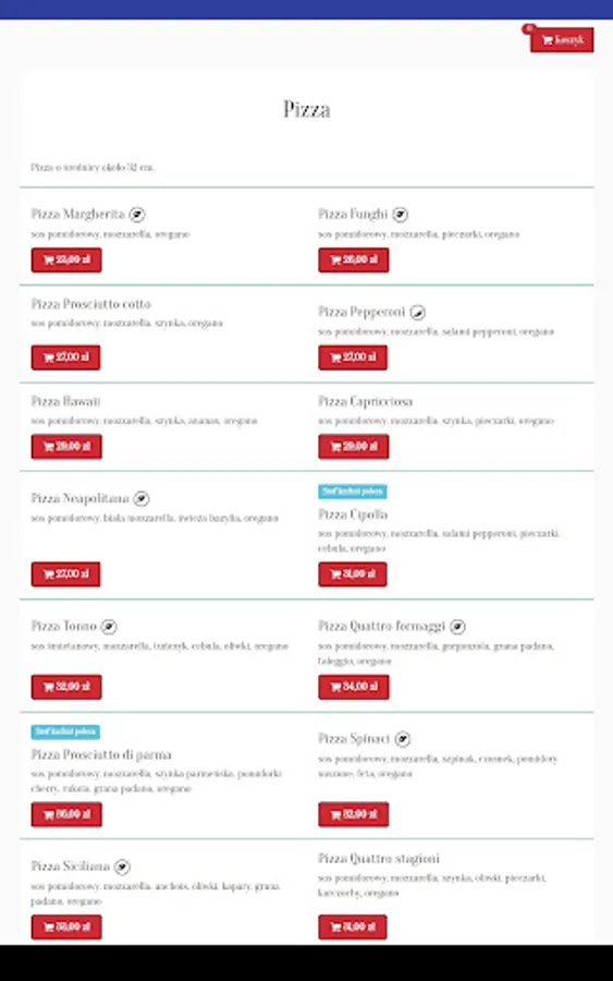 The application for ordering food from the restaurant Pizzeria Wloskie Klimaty in Warsaw.