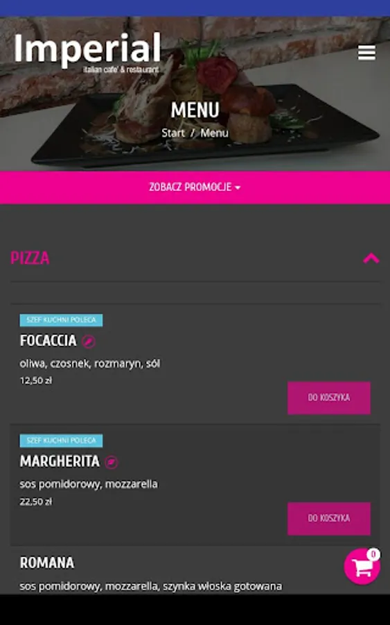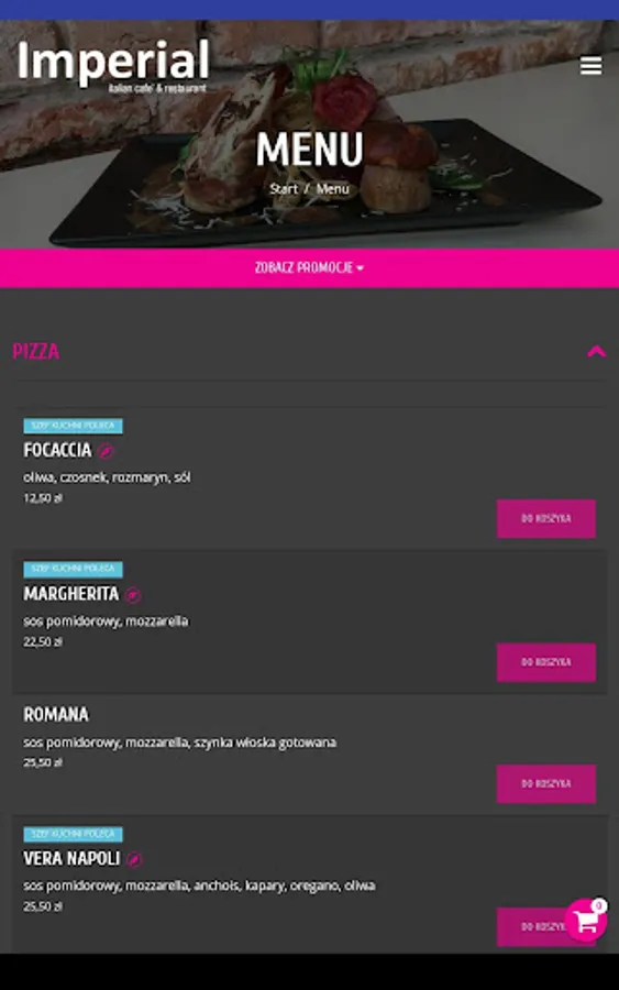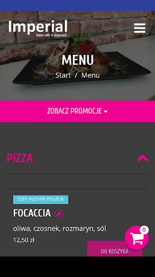 Application for ordering food from the Imperial restaurant in Nowy Sącz.