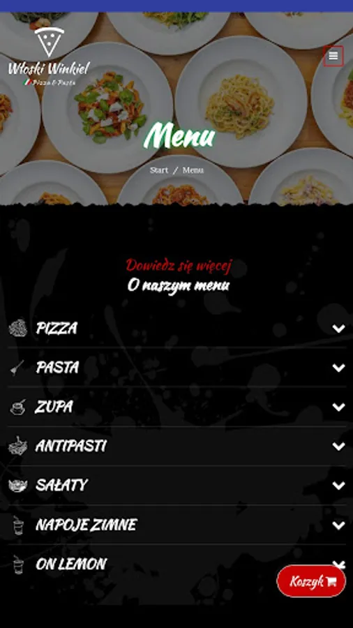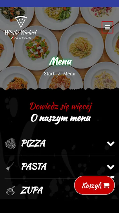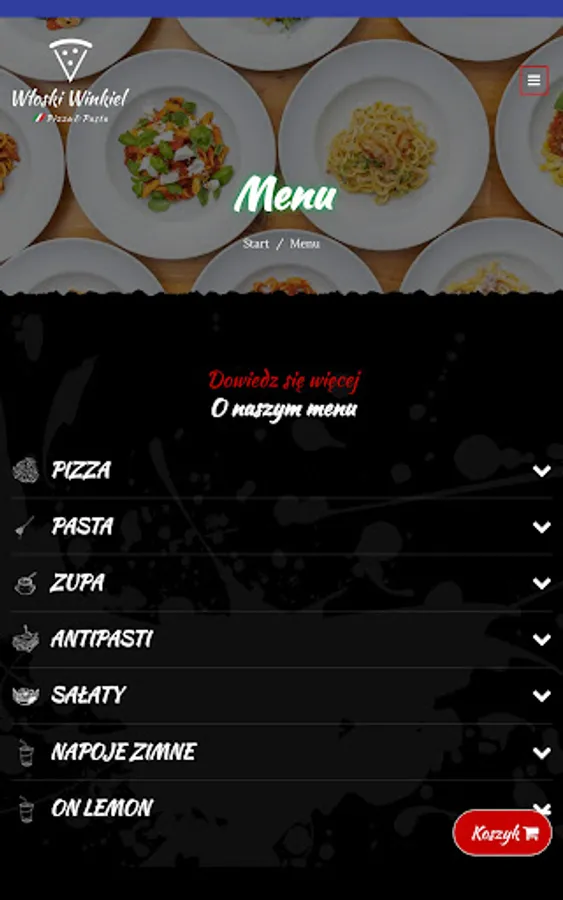 An application for ordering food from the Włochy Winkiel restaurant in Poznań.