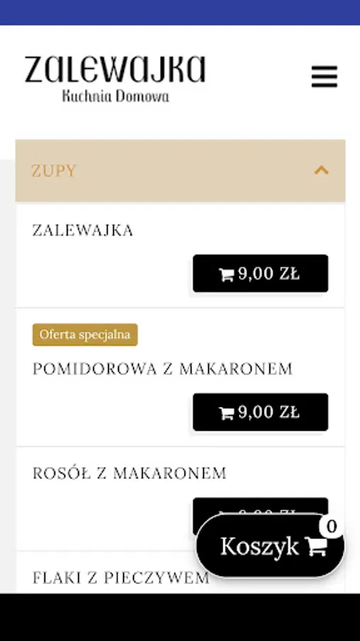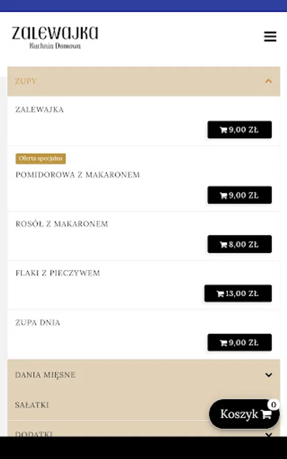 Application for ordering food from Zalewajka Kuchnia Domowa restaurant in Sosnowiec.