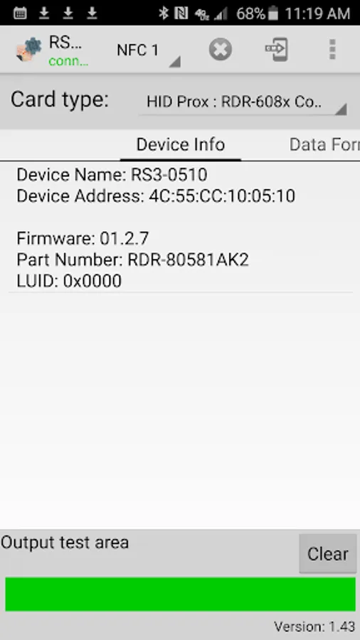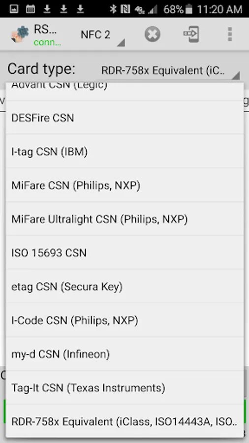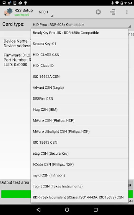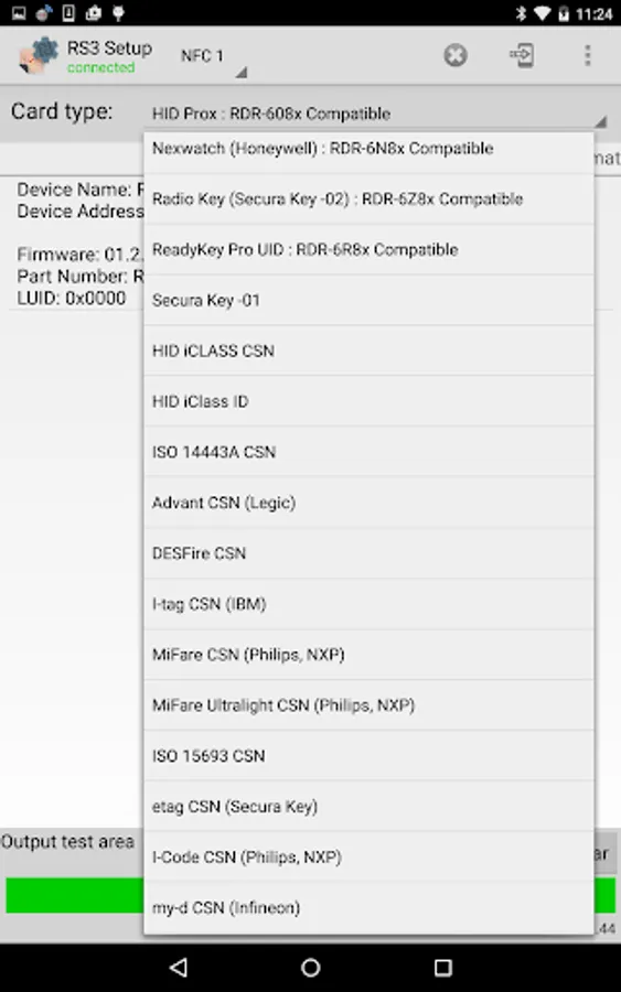 Select card type for ISO15693 & ISO14444A CSN, iClass CSN, Tag-It CSN, my-d CSN (Infineon), I-Code CSN (Philips, NXP), etag CSN (Secura Key), MiFare Ultralight CSN (Philips, NXP), I-tag CSN (IBM), DESFire CSN, Advant CSN (Legic), HID iClass ID, Secura Key -01, ReadyKey Pro UID, Radio Key (Secura Key -02), Nexwatch (Honeywell), NexKey, Quadrakey, KeyMate, 2Smart Key (Honeywell), Keri UID, Pyramid (Farpointe Data) PSC-1 26 Bit, Keri PSC-1 26 bit, Farpointe Data (Pyramid) PSC-1 26 bit, Keri NXT UID, ioProx (Kantech), Indala ECR Custom, Indala ASP+ Custom, Indala ASP+ UID (Motorola), Indala ASP Custom, Indala ASP UID (Motorola), Indala ASP 26 bit (Motorola), ID Teck, HiTag 2, HiTag 2 Alternate, HiTag 1 & S, HiTag 1 & S Alternate, HID Prox UID, HID Prox, GProx-II UID, EM 410x Alternate, Rosslare, EM 410x, DIGITAG, Paradox, CDVI, CASI-RUSCO (GE Security, UTC), Russwin UID, Cardax UID, Awid