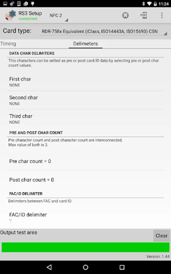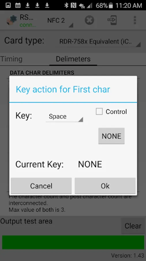 Setup delimiters for character(s) sent before and after each scan for using the RS3 NFC reader in keyboard simulation mode.