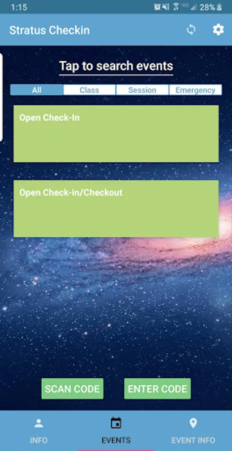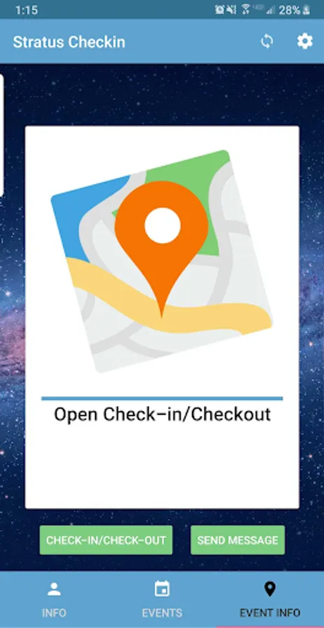 Users can select from a list of available events or enter a pin code to access hidden and locked events and automatically check themselves in when they arrive and checkout when they leave. Users can also send SMS messages directly to designated administrators that automatically contain the user’s information such as name, phone number, email, and more.
