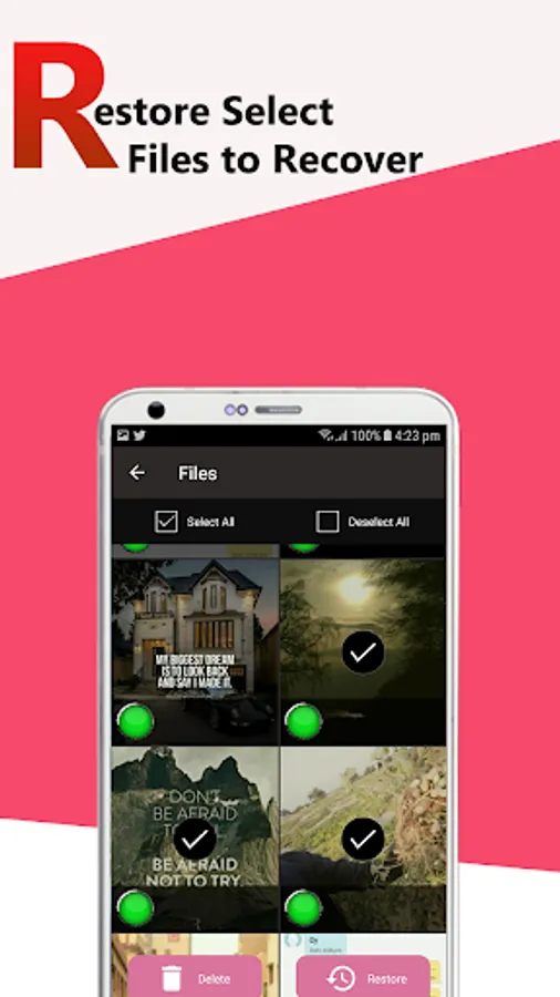 works exactly like a recycle bin for your phone! Once you’ve downloaded the app, it’ll automatically backup your newly deleted data, allowing you to effortlessly undelete files, pictures and videos - and restore them to your phone!