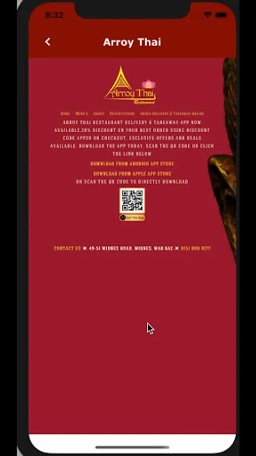 ARROY THAI RESTAURANT DELIVERY & TAKEAWAY APP NOW AVAILABLE,20% DISCOUNT ON YOUR NEXT ORDER USING DISCOUNT CODE APP20 ON CHECKOUT, EXCLUSIVE OFFERS AND DEALS AVAILABLE. DOWNLOAD THE APP TODAY, SCAN THE QR CODE OR CLICK THE LINK BELOW