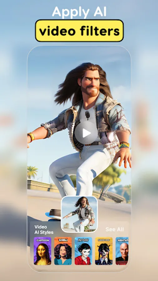 Now you can transform your videos with just one tap using our AI video generator. Simply upload your video and choose the filter that best suits your content: cartoon, anime, manga, sketch, or doll. With so many filters available, it'll be hard to resist restyling your entire gallery