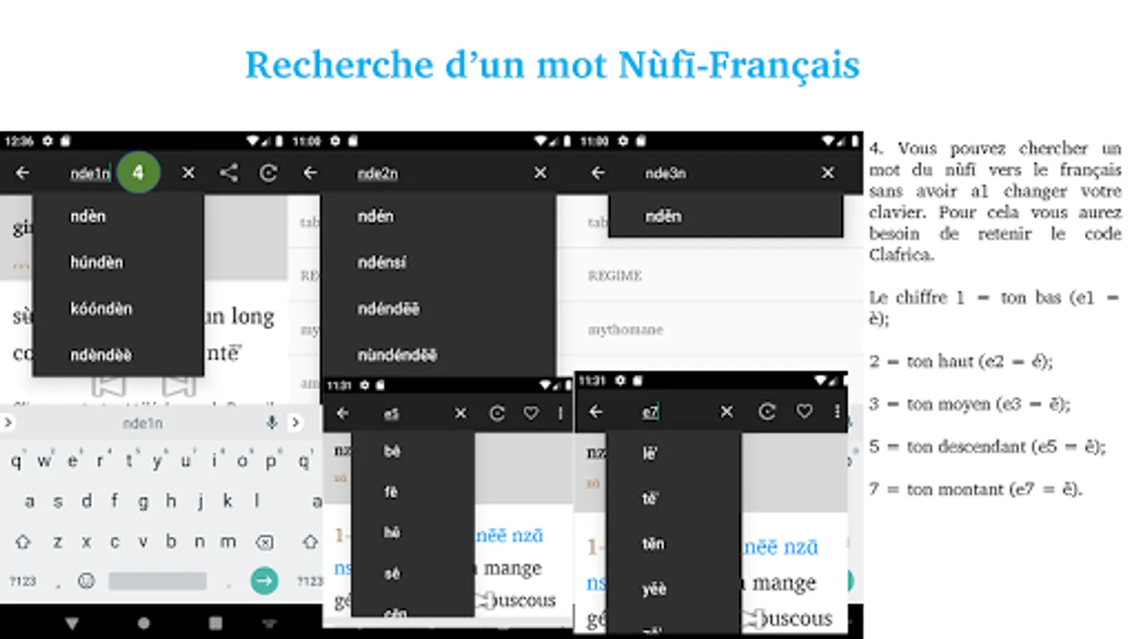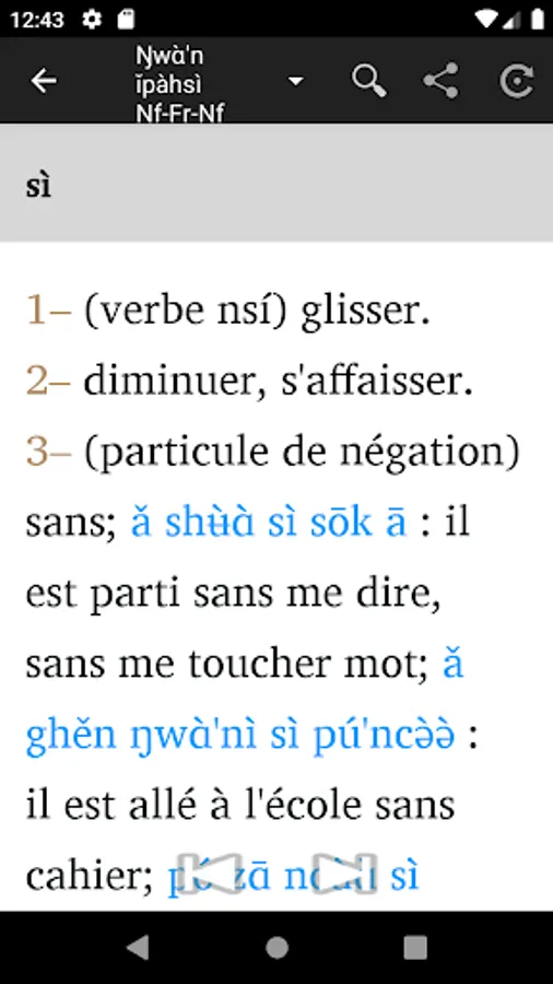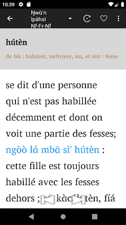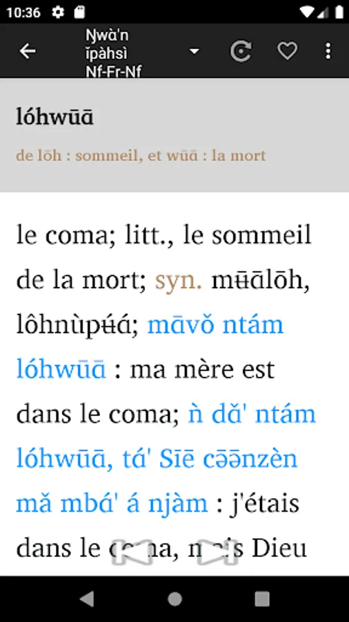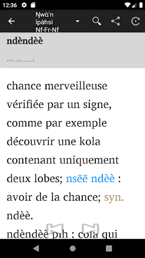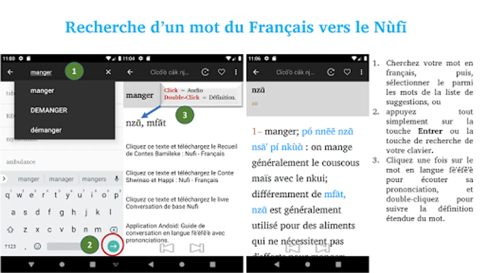 1 - Enter a word either in French or in Nufi , and you will get the translation in the other language.