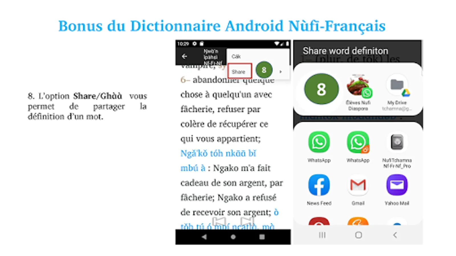With the pro version, it is now possible to share the definition of a word by email and on most social networks (Facebook, Skype, WhatsApp, etc.). Simply access the phone menu, then click on "share" and choose one of the platforms.