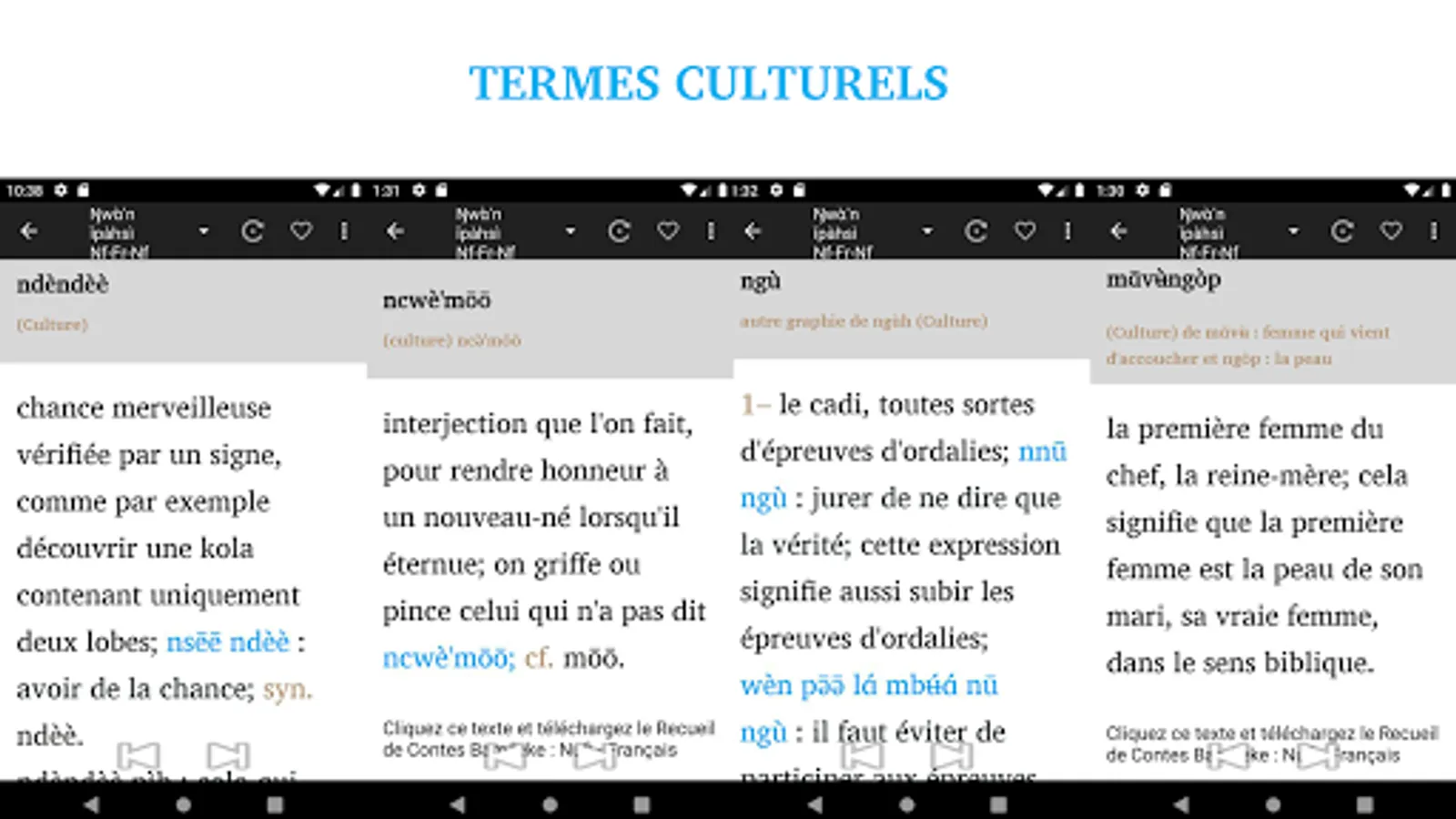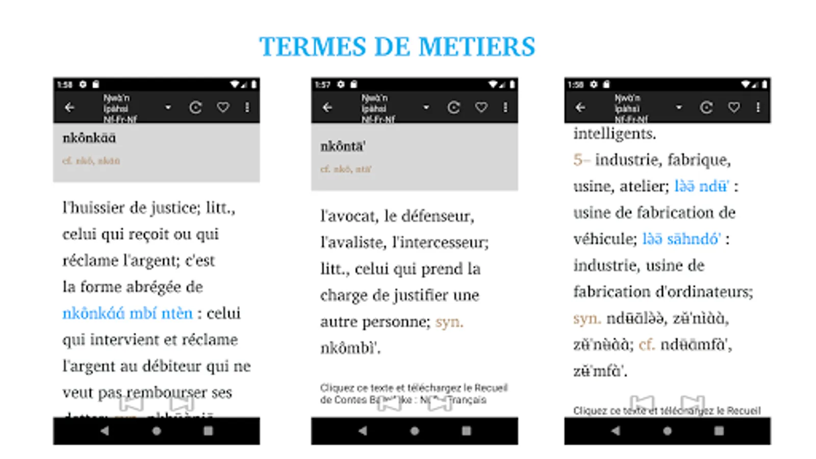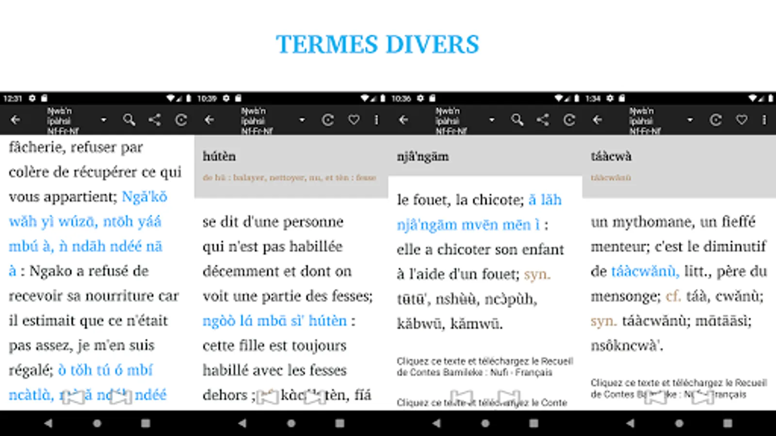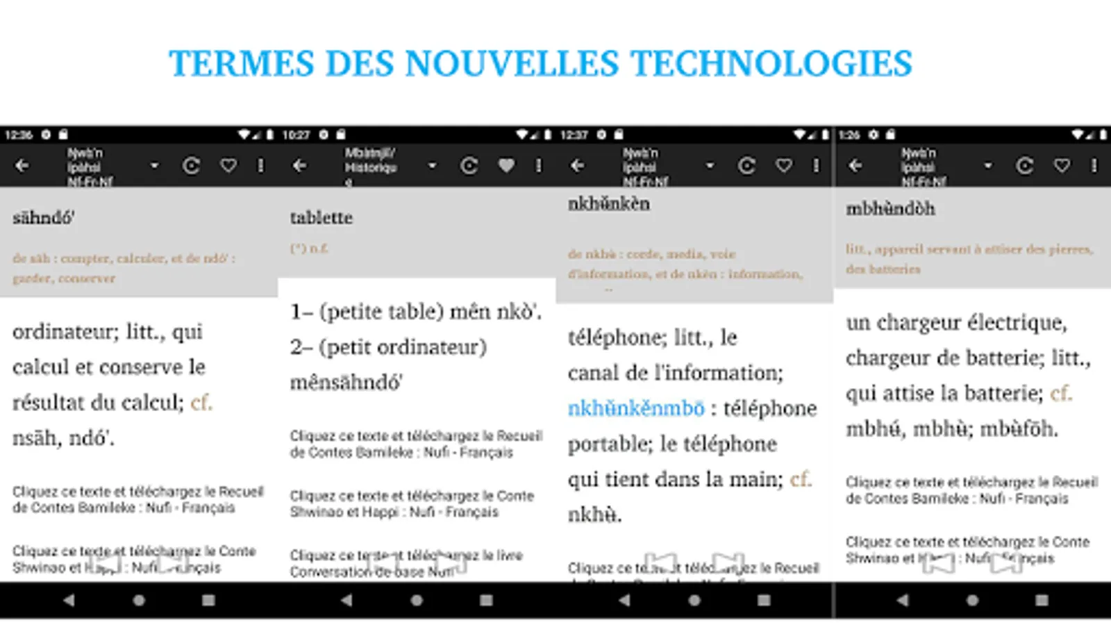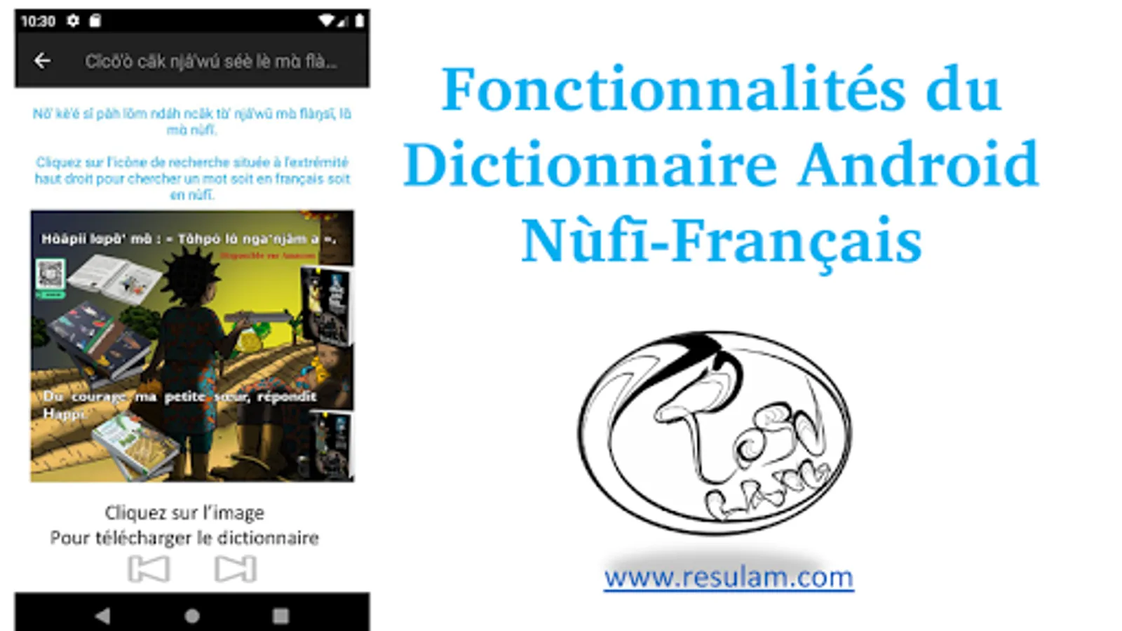 This application is the pro version of the Bamileke Nufi - French- Nufi’s dictionary brought to you by Resulam, Resurrection of Minority Languages as part of its project of reviving minority languages. This version contains almost all Nufi words you can imagine, and beyond! It will be updated on regular basis and those who have this version will receive subsequent updates for free. The printed version will also be available in the future.